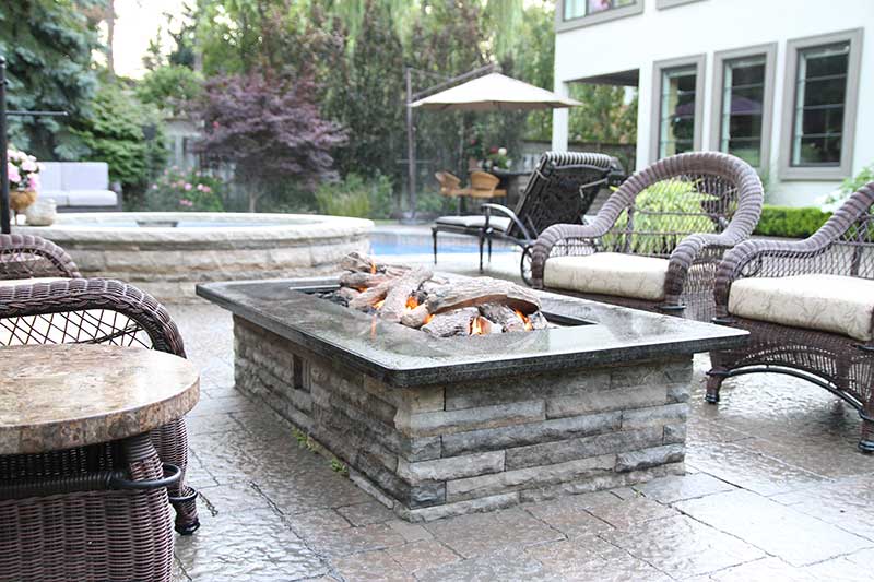 stone work, gas fire pit, circular built in BBQ and Bar and a very large expanse of patio space. All the planting and